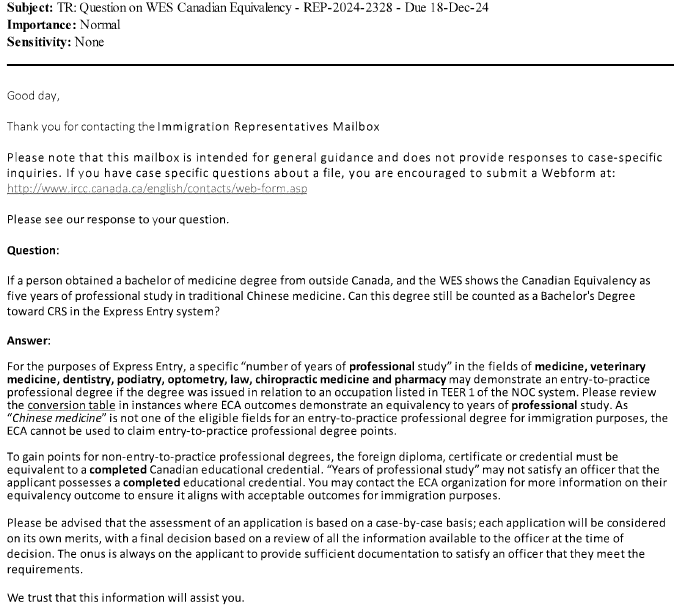 For example, as indicated in the correspondence below between an immigration representative and the IRCC Immigration Representatives Inbox, if an individual completes a one-year program abroad but an ECA states that its Canadian equivalent is only one semester, the individual will not get credit for a one year program.